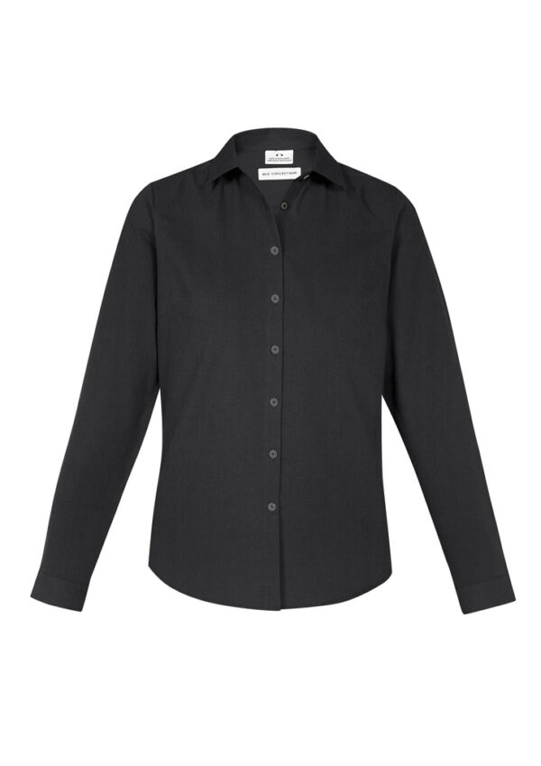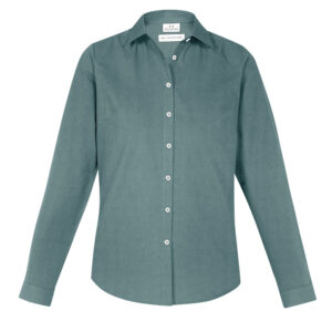 Ladies style features semi-fitted silhouette, with shirt tail hem and back box pleat Can be worn tucked in or out |